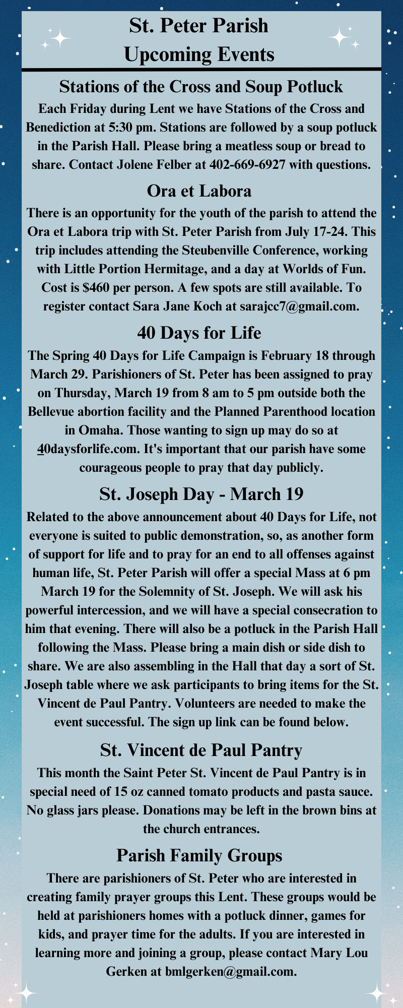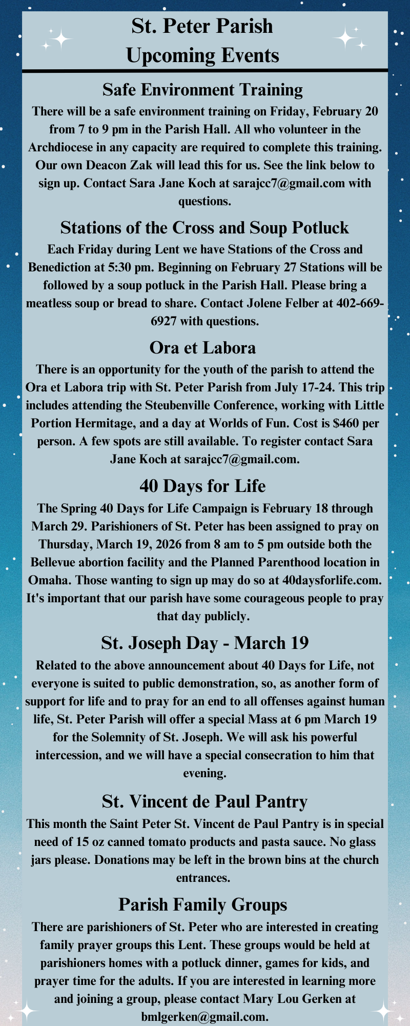 We are a parish of mostly English- and Spanish-speaking peoples located on the outskirts of Omaha's downtown where we are blessed to be able offer both the Gospel and the corporal and spiritual works of mercy to our neighbors in need.