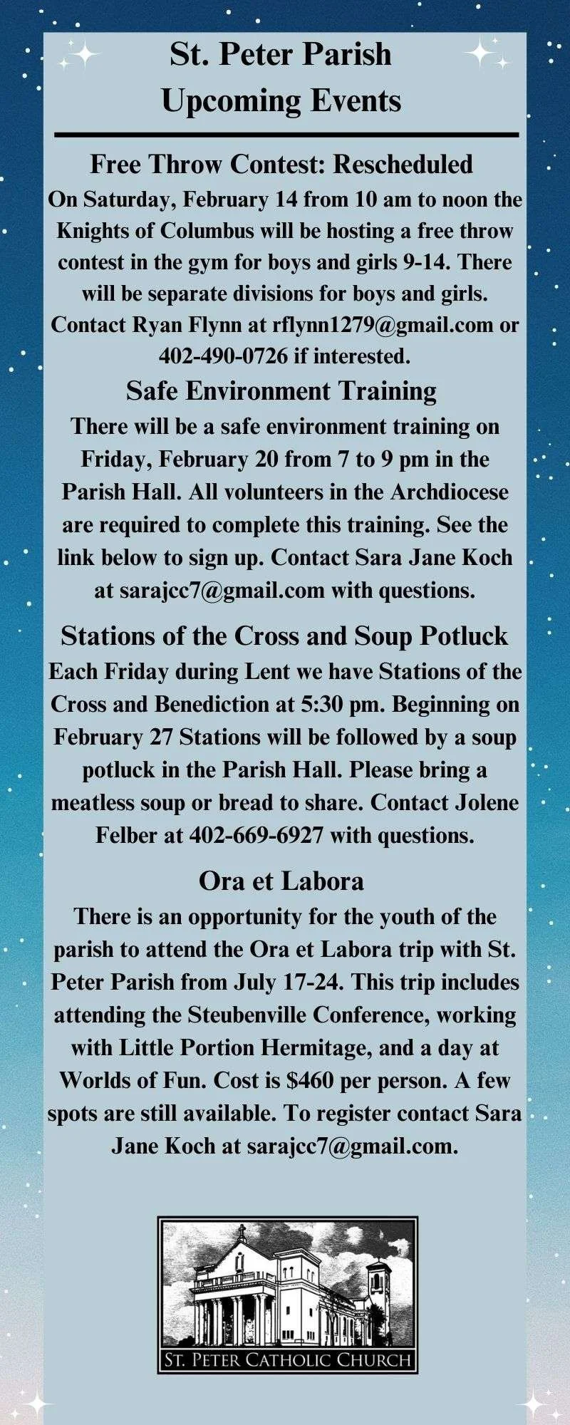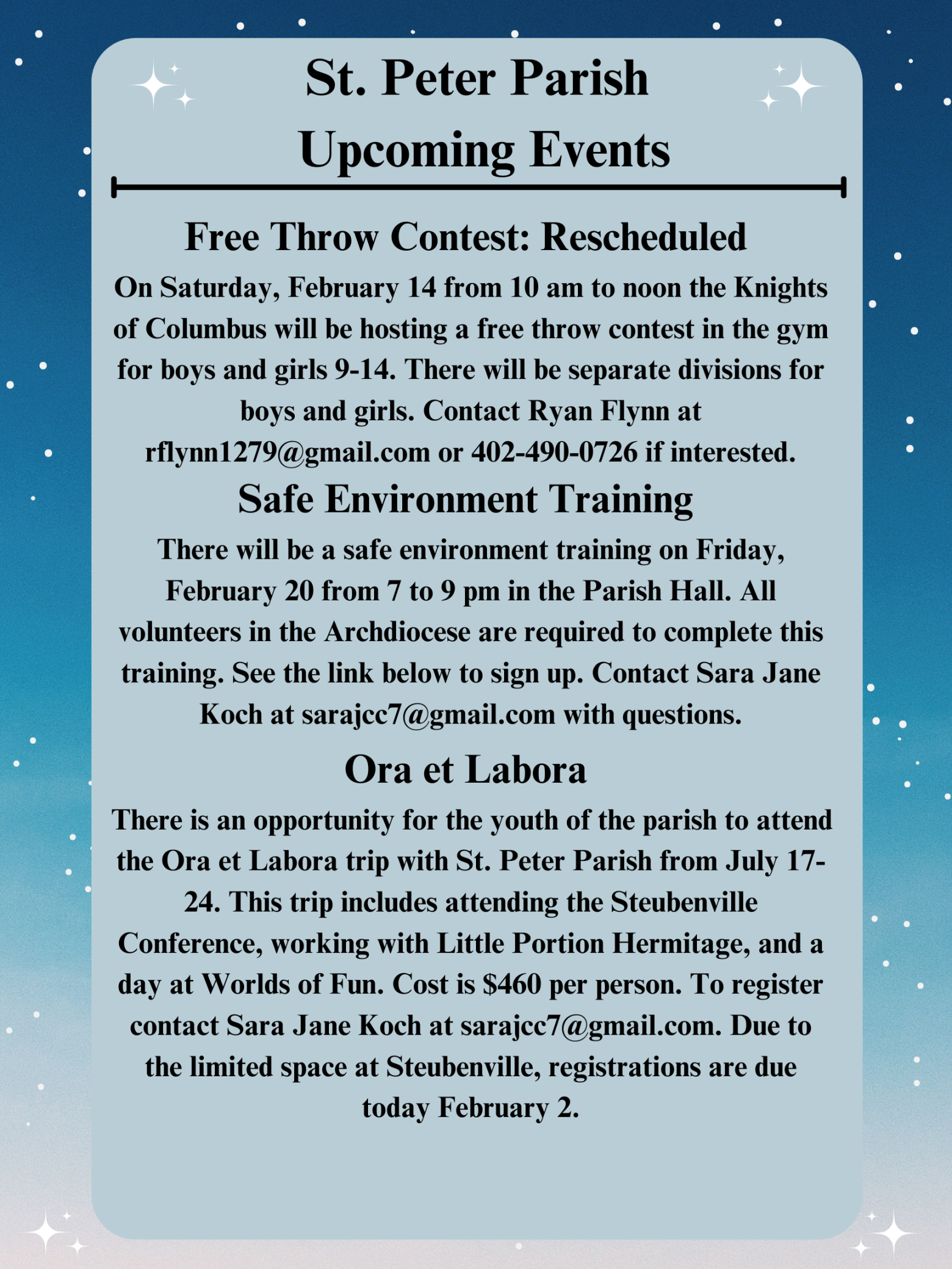 St. Peter Catholic Church is dedicated to the restoration of the sacred, the active promotion of the Gospel, and fidelity to the Magisterium of the Catholic Church.